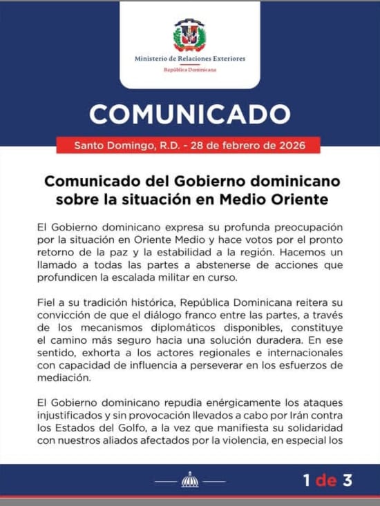 Radar Voz, República Dominicana.- El Gobierno de la República Dominicana manifestó su preocupación ante el aumento de las tensiones militares en Oriente Medio y condenó los ataques que atribuye a Irán contra varios Estados del Golfo.